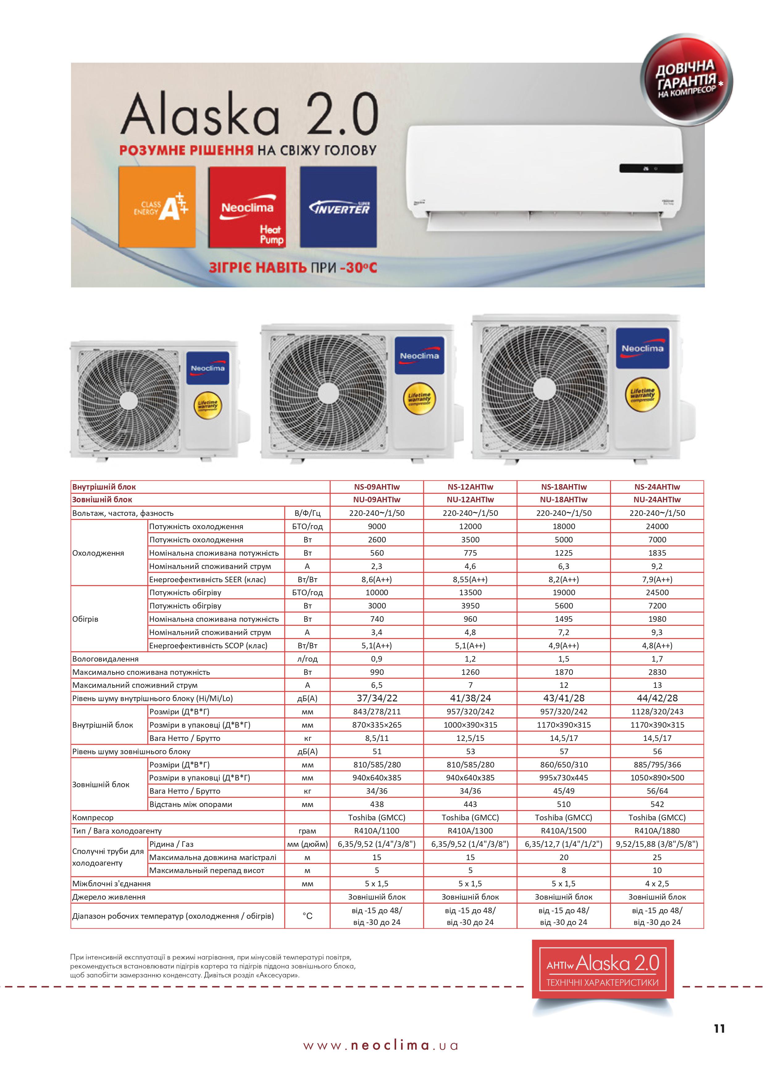 Neoclima NS/NU-AHTIw Alaska 2.0 – високоефективний тепловий насос, який може працювати на обігрів від +24 °С до -30 °С, та на охолодження від +48 °С до -15 °С, при цьому забезпечує надзвичайно високі показники сезонної енергоефективності SEER - 8,6 (максимальний A+++) та SCOP - 5,1(максимальний A+++). Такі високі показники досягаються завдяки використанню новітніх технологій: